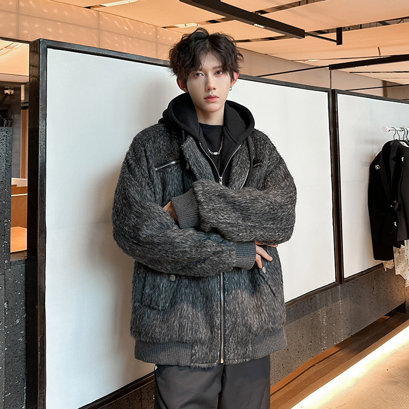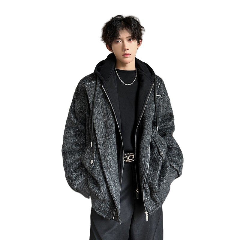 Grey woolen coat men’s spring and autumn hooded jacket zipper solid color